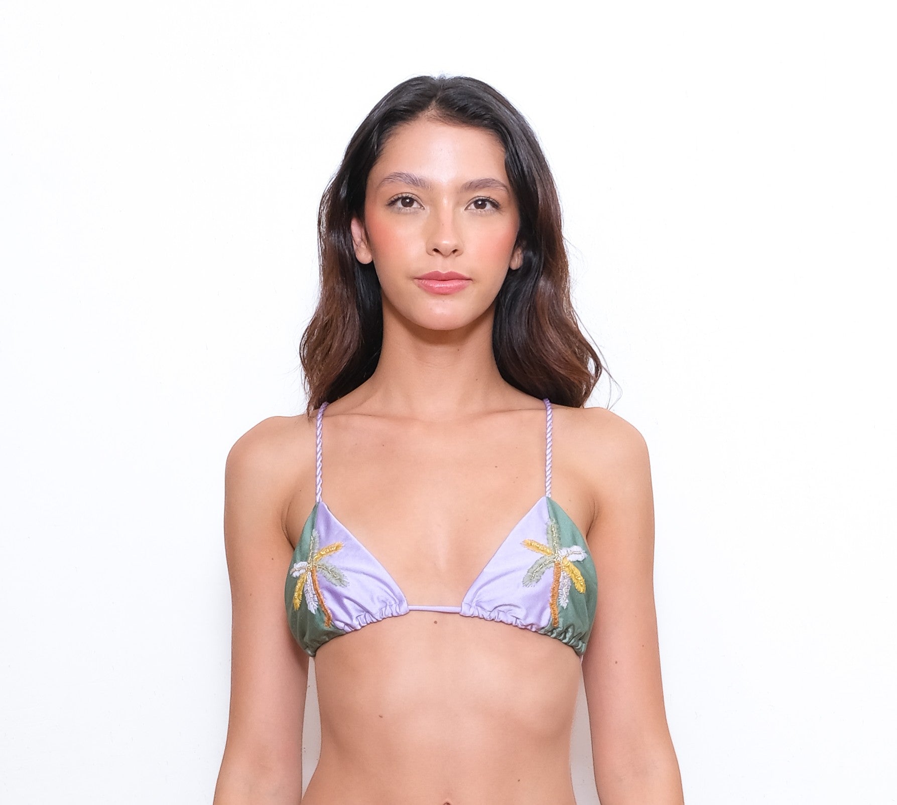 El top Summer Vibes es un triángulo clásico con un giro moderno y lleno de estilo. Sus tonos vibrantes en contraste evocan la frescura del verano, mientras los detalles bordados de palmeras le aportan un aire tropical y único. Sus tiras delgadas ajustables permiten adaptarlo perfectamente al cuerpo, brindando comodidad y un look femenino y sofisticado para disfrutar bajo el sol.